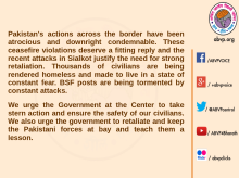 Pakistan's actions across the border have been atrocious and downright condemnable. These ceasefire violations deserve a fitting reply and the recent attacks in Sialkot justify the need for strong retaliation. Thousands of civilians are being rendered homeless and made to live in a state of constant fear. BSF posts are being tormented by constant attacks.